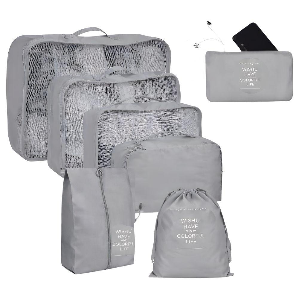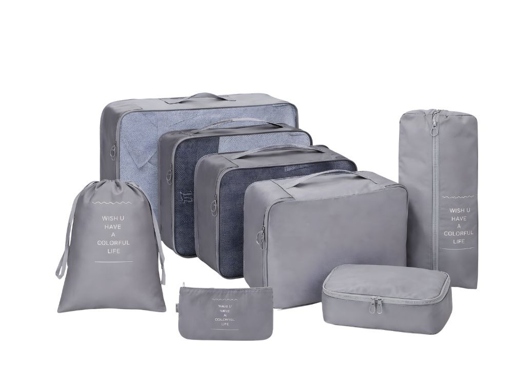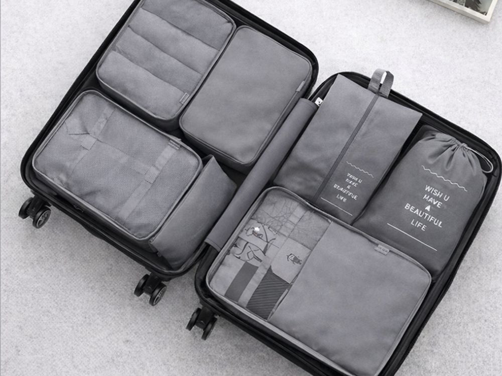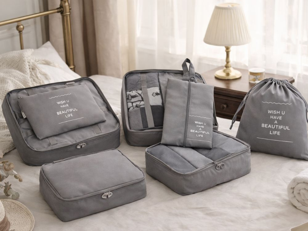 Utazási rendszerező készlet, amely különválasztja a ruhákat és tárgyakat.