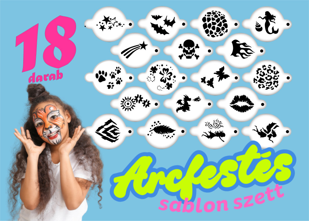 Arc és testfestő sablonjainkkal jelentősen felgyorsíthatod a festést, így sokkal több gyermeket tudsz kifesteni ugyanannyi idő alatt! Kiválóan használható "nagyüzemi festéseknél" város és falunapokon, óvódákban, ahol nagyon sok gyerekarcot kell kifesteni megadott idő alatt.