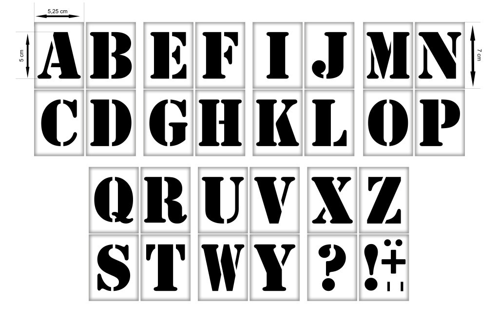 Betűk műanyag stencil - festősablon szett 5 cm-es magasság (betű) 7 cm x 5,25 cm teljes sablon méret.