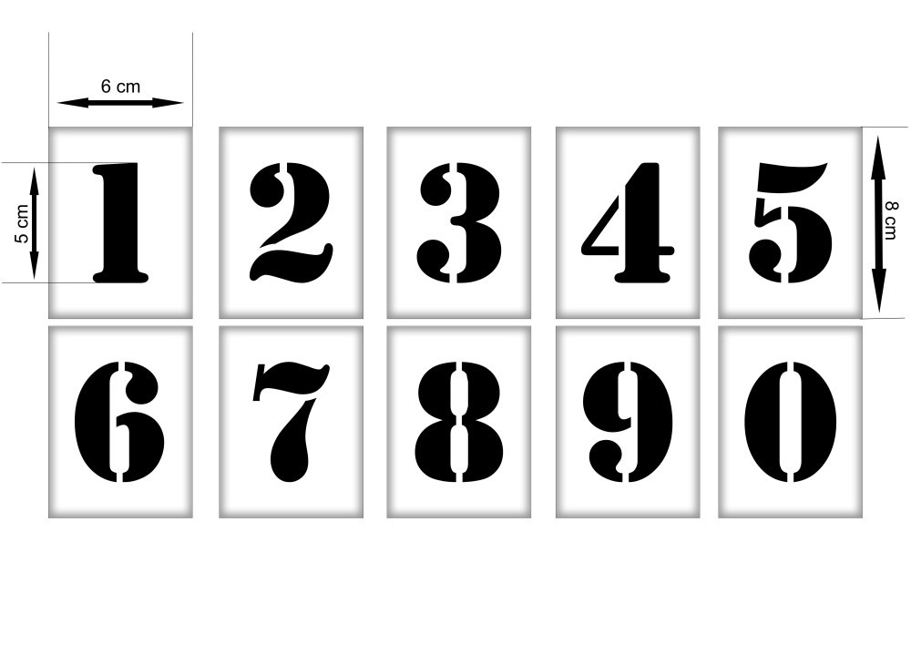 Számok műanyag stencil - festősablon szett. 0-tól 9-ig számok 5 cm-es magasság (számok) 8 cm x 6 cm teljes sablon méret.