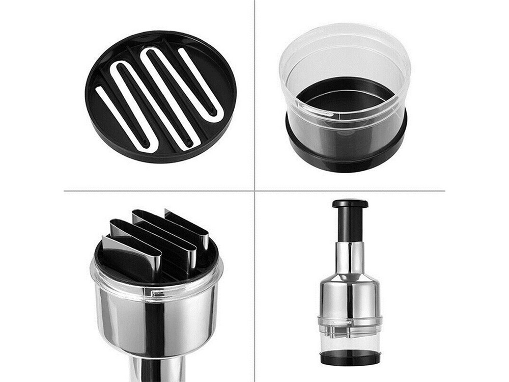- Hatékony Aprítás: A készülék egyedi mechanizmusa a nyomókar lenyomásával automatikusan forgatja a pengéket, így gyorsan és egyenletesen aprítja a tartályban lévő összetevőket.