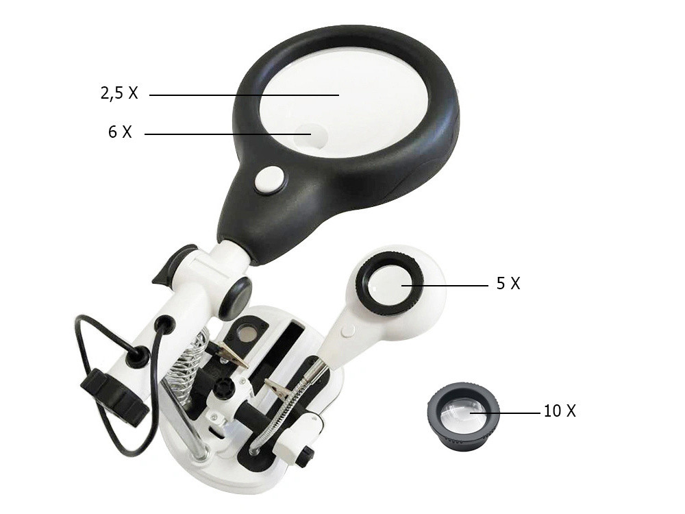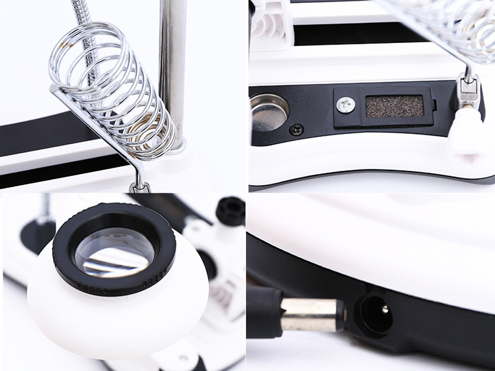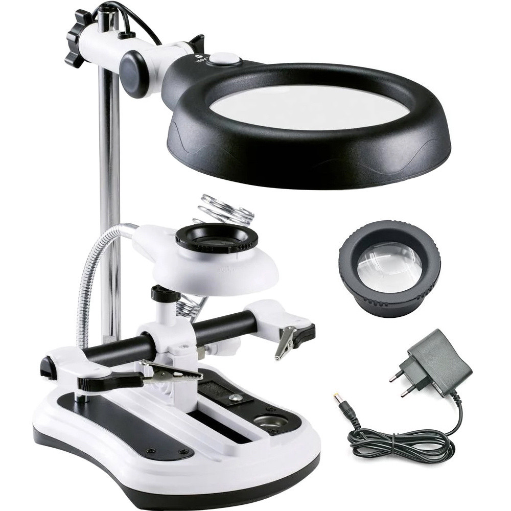 Ez a harmadik kéz forrasztáshoz LED-es nagyítóval nélkülözhetetlen segédeszköz minden elektronikai hobbista és profi számára. Stabil csipeszek, erős nagyító és beépített LED világítás segíti a pontos, kényelmes munkát.