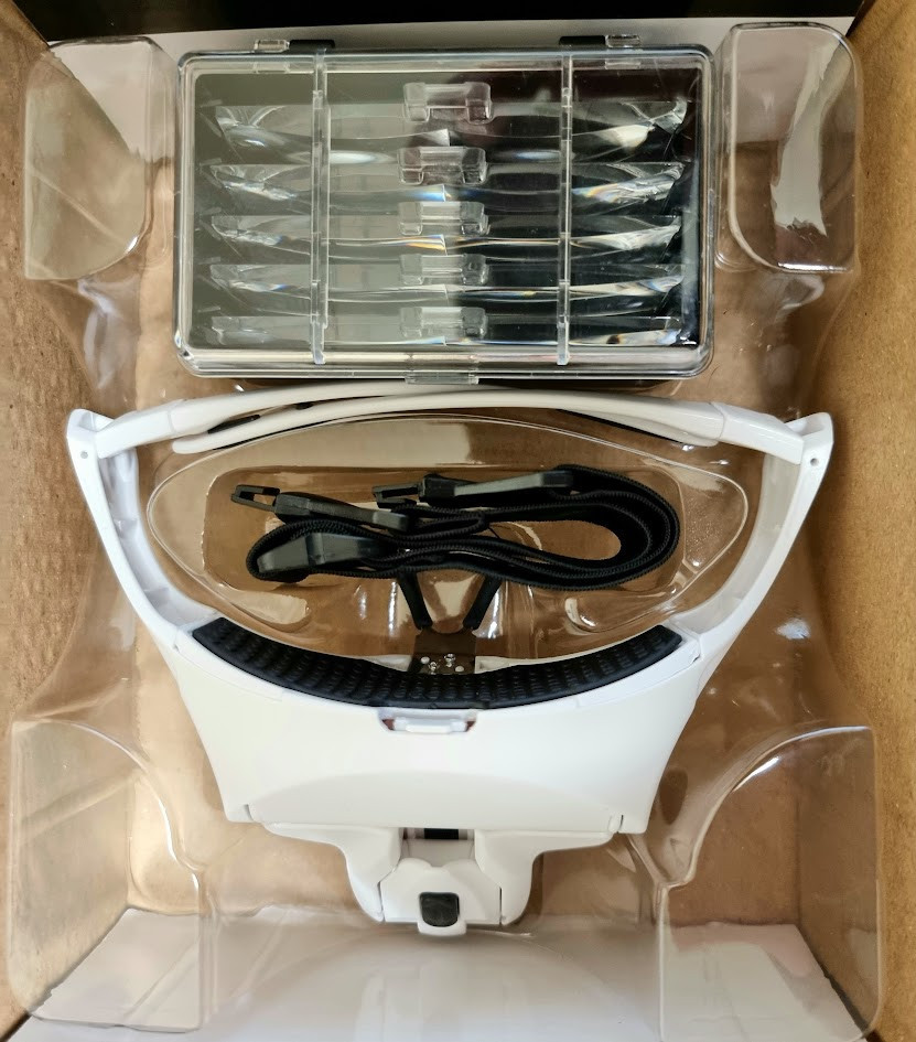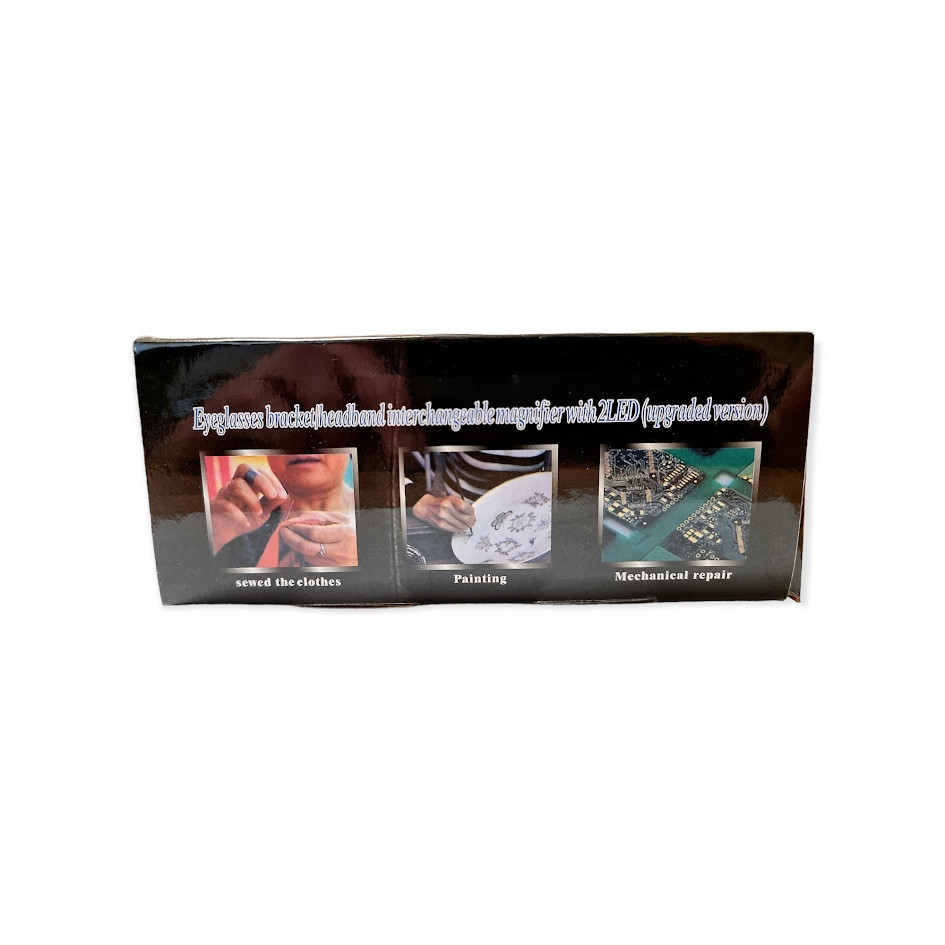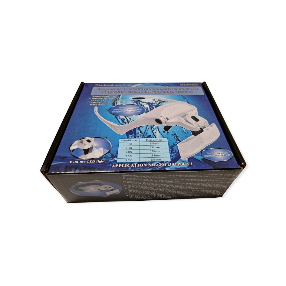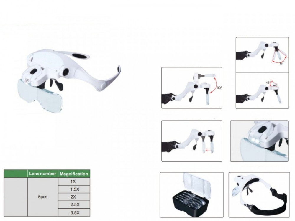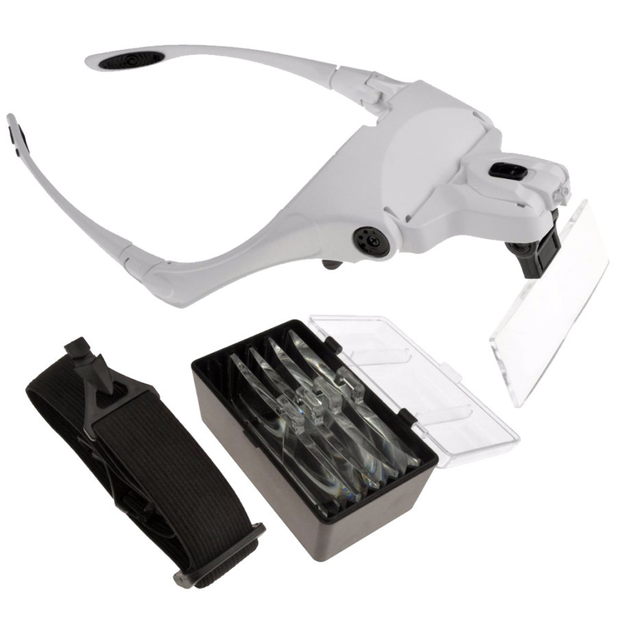Professzionális nagyító szemüveg készlet 2 ledes izzóval 5 féle cserélhető nagyító lencsékkel, pánttal és lencse tisztító kendővel.