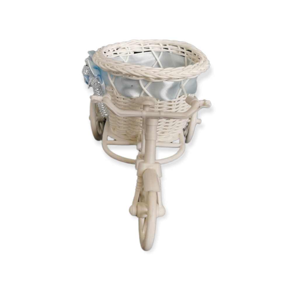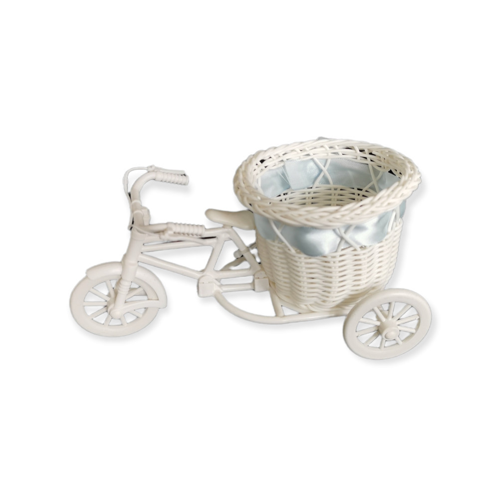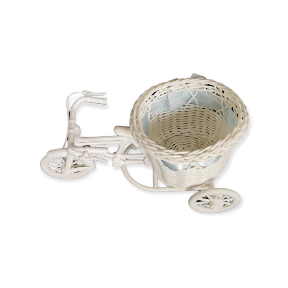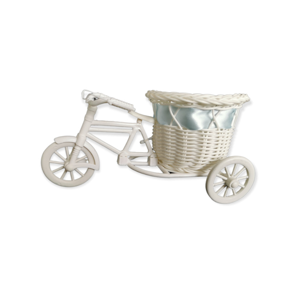 Virágtartó műanyag tricikli, mely műanyag fonott kosárral, selyem szalaggal van díszítve, amiben közepes méretű növényeket és egyéb dekorációs kiegészítőket helyezhetsz el.