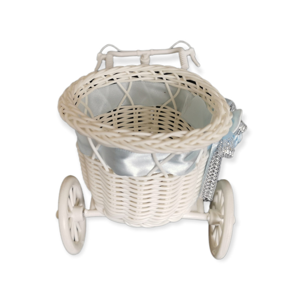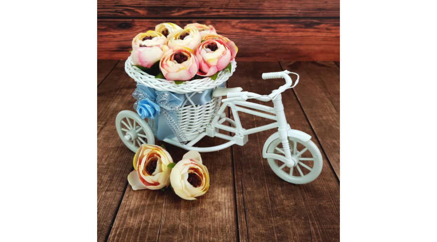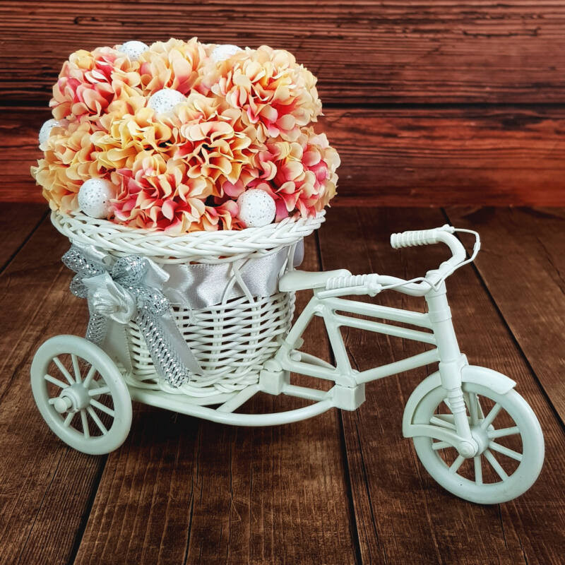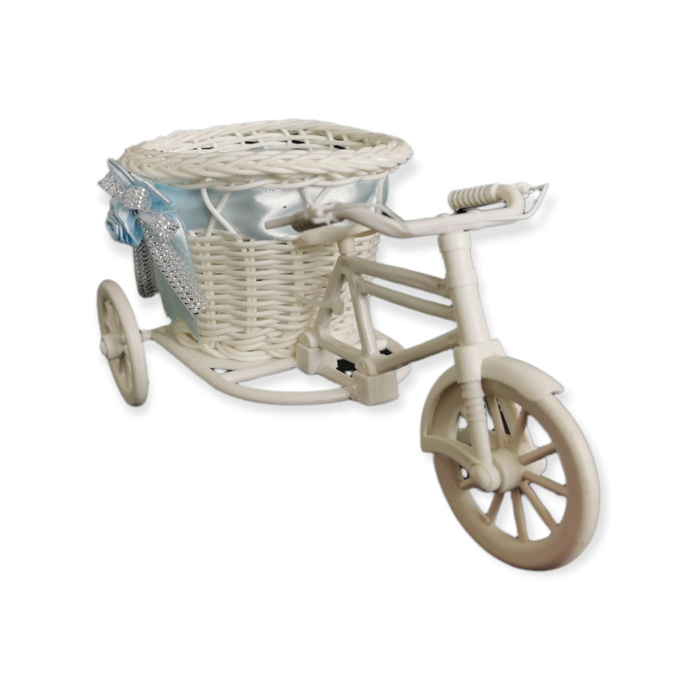 Virágtartó műanyag tricikli, mely műanyag fonott kosárral, selyem szalaggal van díszítve, amiben közepes méretű növényeket és egyéb dekorációs kiegészítőket helyezhetsz el.